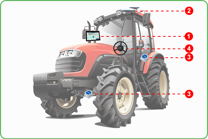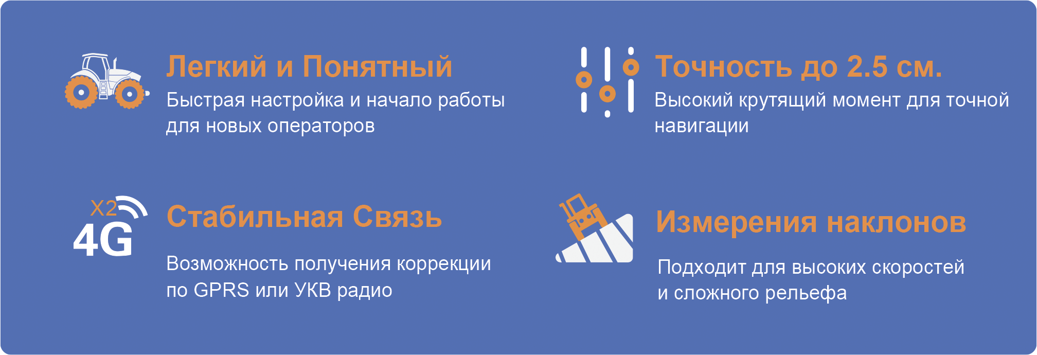 Благодаря гибкой конфигурации и специальным математическим алгоритмам работы, система может быть установлена на различные виды сельскохозяйственной техники: пропашные и шарнирно‑сочленённые тракторы, опрыскиватели и зерновые комбайны.