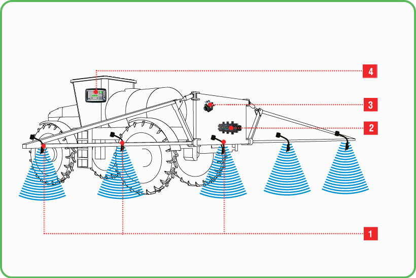 Система контроля высоты стрелы NORAC поддерживает штангу на заданном уровне, производя адаптивную и точную регулировку. Удержание распылительных форсунок на рекомендуемой высоте позволяет вносить химикаты обеспечивая более равномерное внесение и уменьшая потери.
